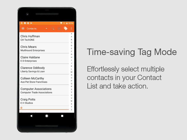 Tag Mode in Handheld Contact is based on the Act! feature and focuses on fast, seamless interactions with multiple people. Select multiple contacts in your Contact List in Handheld Contact and with a single press instantly create a lookup, send them an e-mail, send them a text message, or pinpoint their addresses in a single map to see where they are.